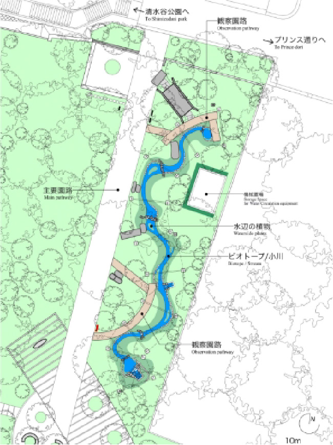 東京都心や皇居周辺地域にも在来の個体としてヘイケボタルが生息していることが確認されており、それらが生息可能な環境をこのビオトープに創出することにより、この地域に固有の生態系を継承しようとしています。