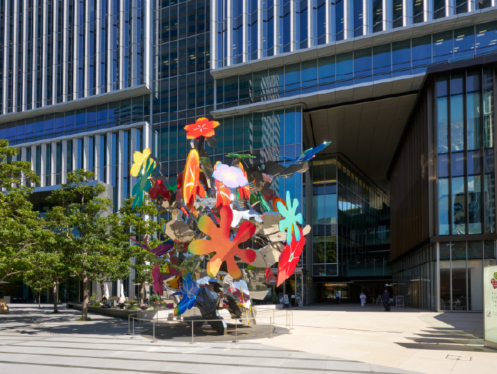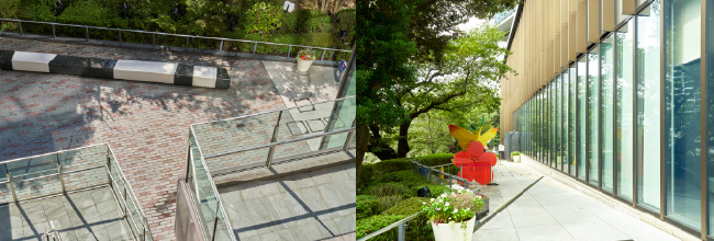 花々や蝶を表現したパブリックアートを中心とした広場は、紀尾井町通りと一体化した都市的賑わいを感じさせつつ、水と緑を演出した心地よい空間。