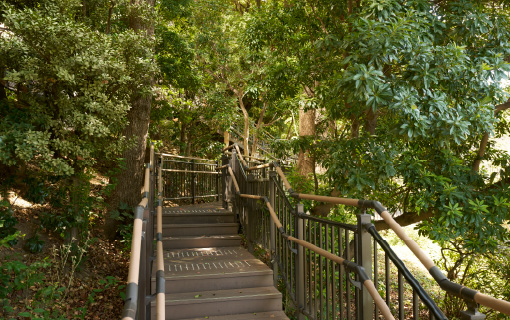 弁慶濠を眺めることができるウッドデッキの散策路。テラスの小道から、木立の中に作られたウッドデッキの散策路を歩いてみませんか。弁慶濠を通る涼しい風が吹く中、木陰で休憩したり、赤坂御門跡に見られる江戸時代の石垣を眺めることができます。