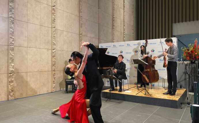哀愁を感じる美しい旋律と躍動するリズムを、バンドネオン、ヴァイオリン、ピアノ、コントラバスのカルテットが奏で、秋の夕暮れに情熱的なピアソラの世界を堪能しました。