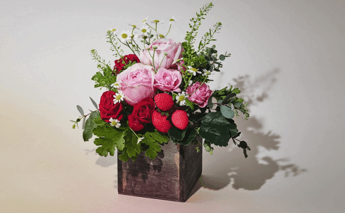 バラとイチゴを使ってお庭から摘み取ってきたようなナチュラルスタイルのアレンジメントを作成していただきました。