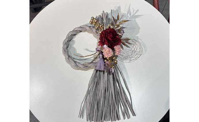 ライトグレーのしめ縄に落ち着いた色味の造花を使用し、上品な雰囲気のお正月飾りを作りました。