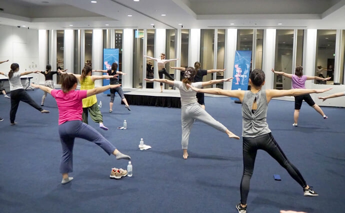 バレエフィットネス(バレトン)は、フィットネス・バレエ・ヨガの3つの動きを取り入れたエクササイズです。音楽に合わせてスクワット・バレエのポーズを繰り返し行い、楽しく汗をかきながらのエクササイズの時間となりました。