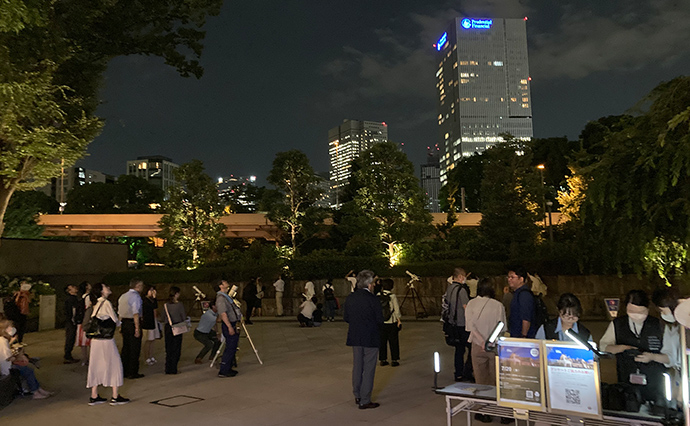 また、当日は梅雨明け前にも関わらず星が良く見えたため、講演後に空の広場へ移動し、簡易観望会を行って夏の大三角などを楽しみました。