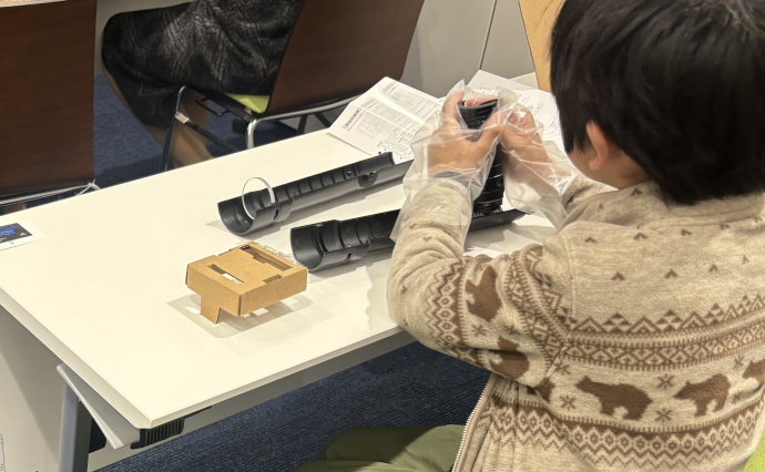 講師は組立てキット開発に関わった国立天文台の縣准教授。参加者は「なぜ星を大きく見ることができるのか?」など、望遠鏡の仕組みやレンズと光の関係を学びながら、望遠鏡づくりに取り組みました。