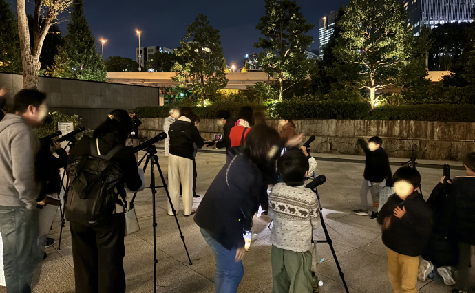 この望遠鏡で観察することができる「月のクレーター」や「木星の衛星」など星、宇宙のことや望遠鏡の歴史などの講義のあとは、紀尾井テラス3F「空の広場」に移動し、全員で星空の観察をしました。