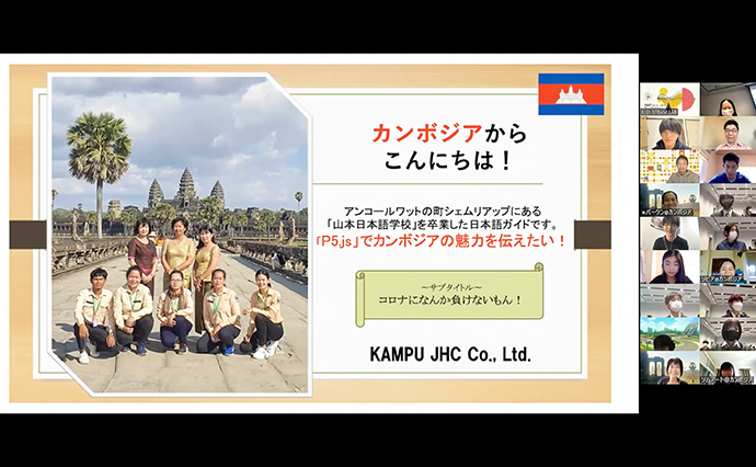 今回は、steAmが推進する共創STEAMネットワーク「未来の地球学校」より、カンボジア(山本日本語学校)の皆さんやドルトン東京学園中学校、関西学院千里国際学園高等部、福島大学の皆さんに登場いただき、プログラミング初心者でも簡単に絵を描いたり動かしたりできる言語”p5.js”を使った作品紹介と、参加者皆さんの作品つくりのお手伝いもしていただきました。