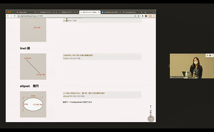 3月9日開催に引き続き、steAmが推進する共創STEAMネットワーク「未来の地球学校」より、カンボジアの皆さんやドルトン東京学園中学校、関西学院千里国際学園高等部、福島大学の皆さんに参加いただき、プログラミング初心者でも簡単に絵を描いたり動かしたりできる言語”p5.js”を使って、作品つくりにチャレンジしました。
