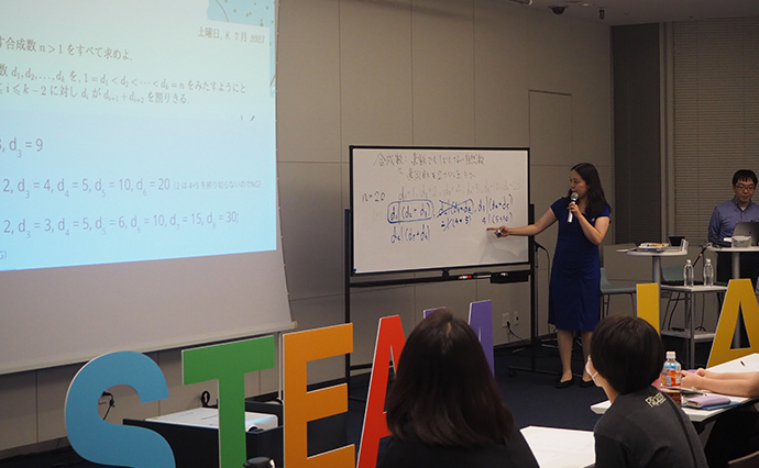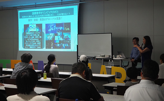 かつてIMOでメダリストに輝かれた中島 さち子先生と、ゲスト講師の近藤 宏樹さんの過去の体験談や写真スライドを交えながら、今年の正答率や問題の傾向まで、詳しく解説していただいた後、5問出題された今年の問題のうち実際に2つの大問に参加者全員でチャレンジ。