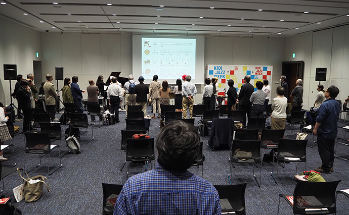 ジャズや世界の民族音楽の背後には面白いリズムがたくさんあります。世界のさまざまな音楽のリズムを多角的に捉えるとどんな不思議があるのかを探っていきましょうと、テーブルを取り払った会場いっぱいに参加者みんなで輪をつくり、音楽に合わせながら手拍子や足でリズムをとり、ビートを刻み、実際に動いてみることで体感的に学んでいきました。