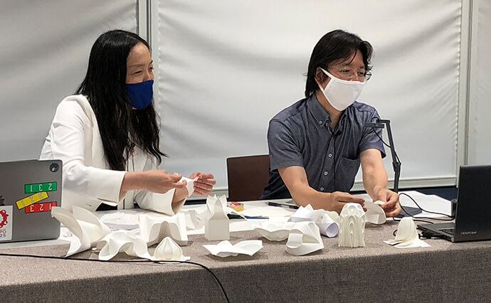 前半は三谷先生のご講演、後半は実際に手を動かし「曲線で折る」という体験を楽しみました。紙から生まれる新しい形を一緒に模索し、チャットで質問を受け付け、Twitterで作品を共有いただきました。