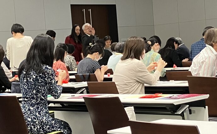 テーブルの上ではなく宙に浮かせた状態で折っていきます、とゆっくり丁寧な実演と説明を聞きながら、最初は、立体的で本物のようなバラを本当に1枚の折り紙でつくることができるの?と驚いていた参加者もワクワクしながら夢中になっていました。