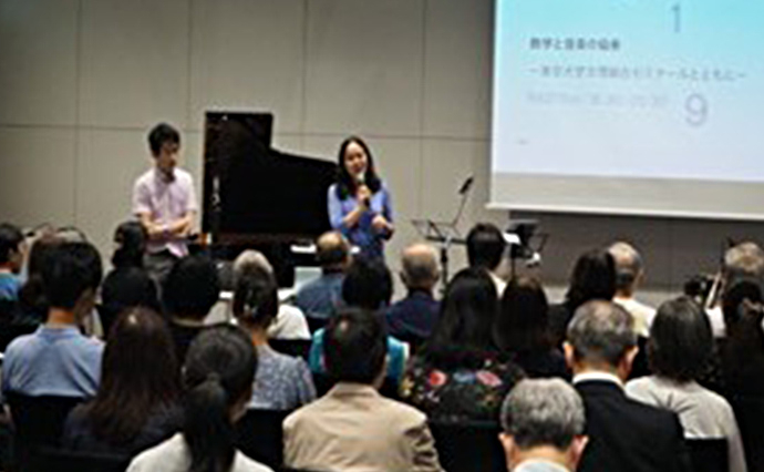 昨年、東京大学で舘知宏先生と中島さち子さんとの協働で、学部生対象の「東京大学文理融合ゼミナール〜数学×音楽〜」が開催され、今回は本ゼミの結果の一部とともに舘・中島両氏の「数学と音楽」についての研究や作品の紹介がありました。