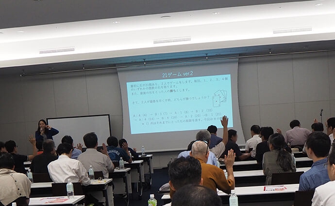 実践・対戦のワークショップ形式で、設定もルールも多彩な石取りゲームをいくつも体験し、数学的に先手・後手必勝が決まる要因を体感していただきました。ゲームの中で試行錯誤を重ねて、背後にある戦略や考え方を発見をし、数学・ゲームの世界を体験していただきました。