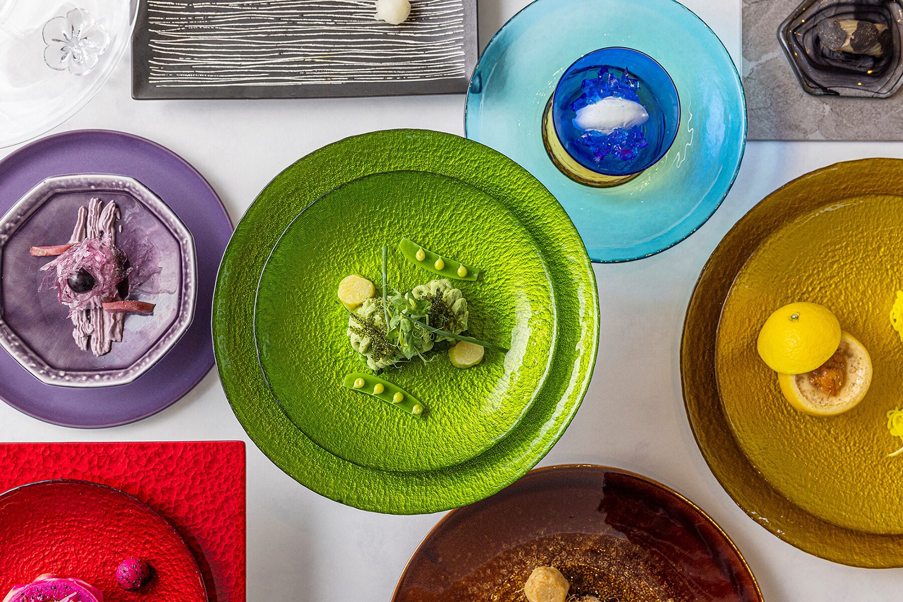 レストランの内装は食材の鮮度を閉じ込める「アイス」をコンセプトに、クリスタル調のインテリアで演出している。このスタイリッシュな空間で、独創的かつセンスの光る料理を生み出しているのが、エグゼクティブシェフの髙橋 賢さんだ。この記事では、髙橋さんの修業時代から和食の未来について、話を伺った。